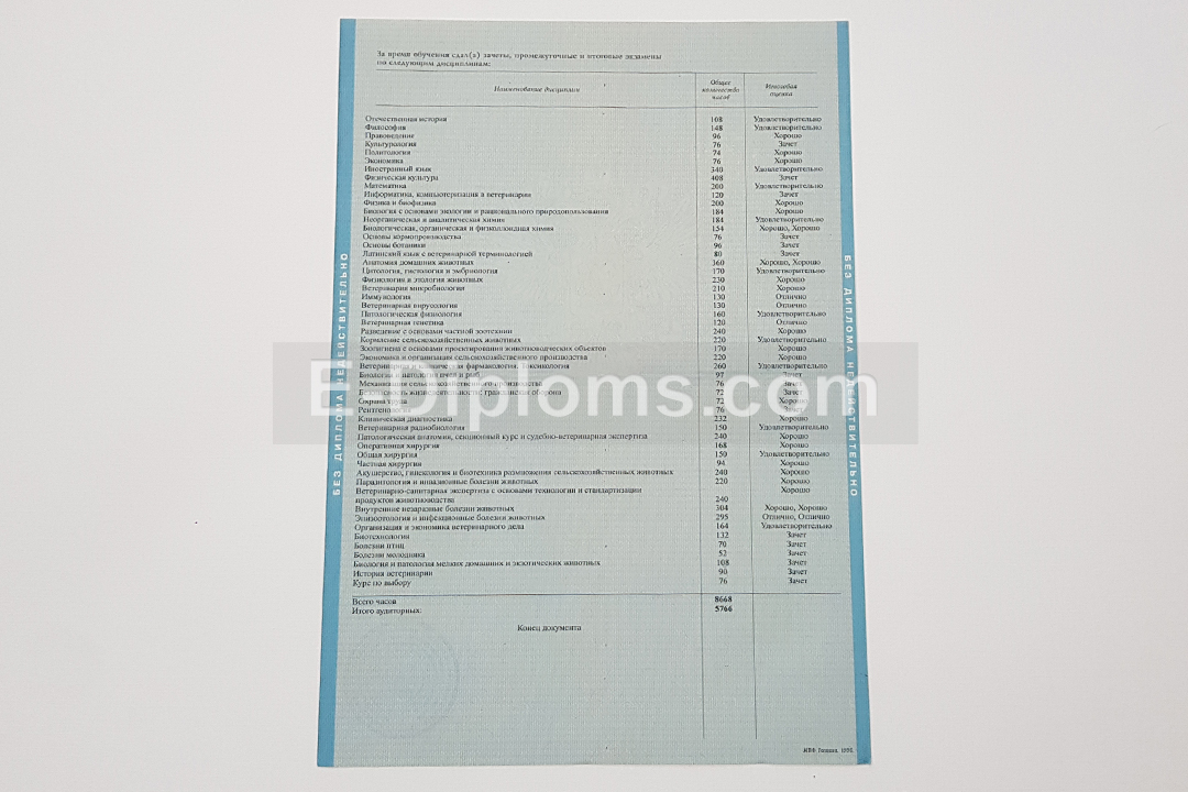 Дипломы на таких же бланках, которые получали выпускники ВУЗов России с 2004 по 2009 года включительно. Учебная программа и все данные по образовательной организации соответствуют периоду; ставим гербовую «мокрую» печать и подписи, как в оригинале.